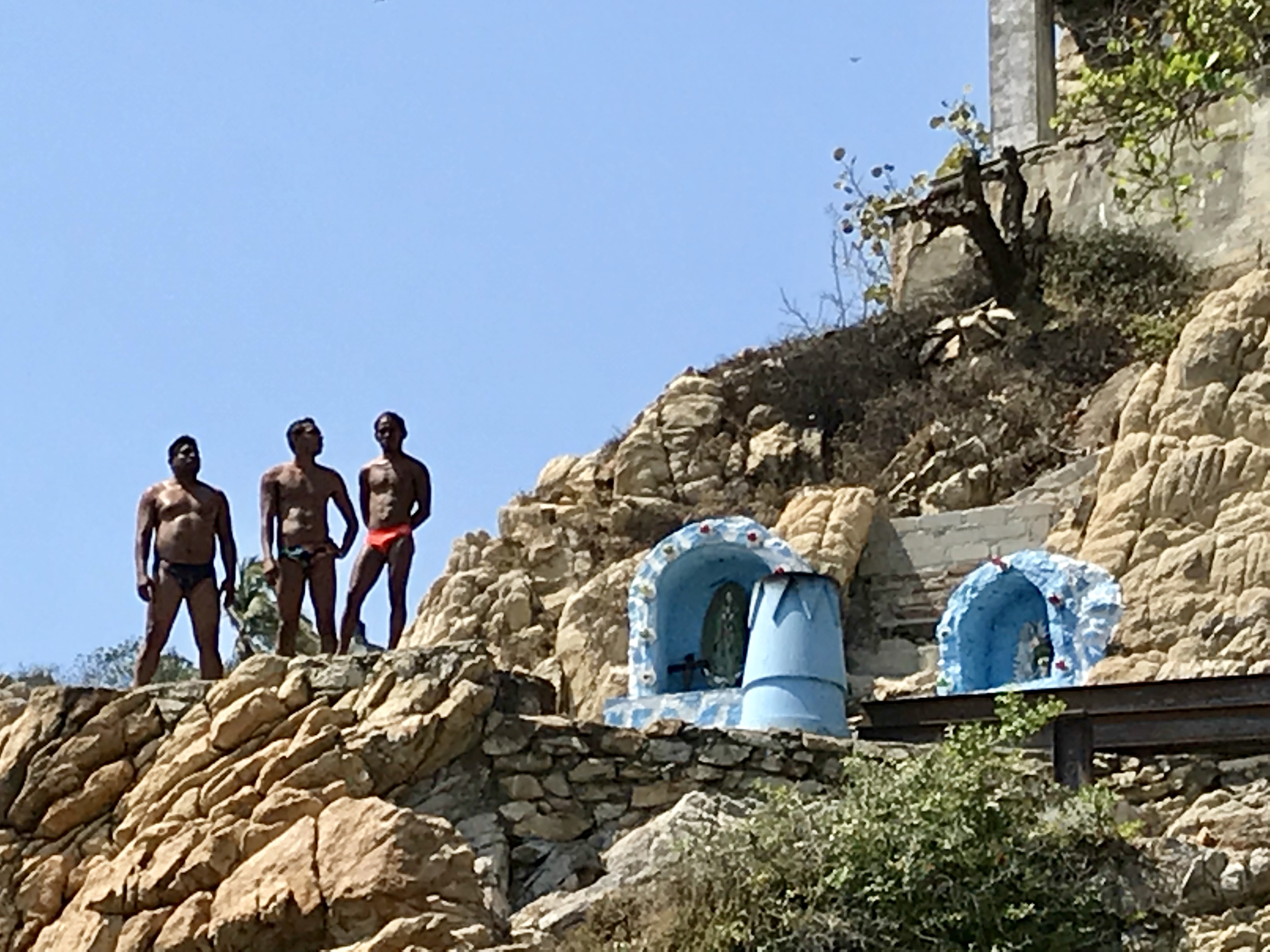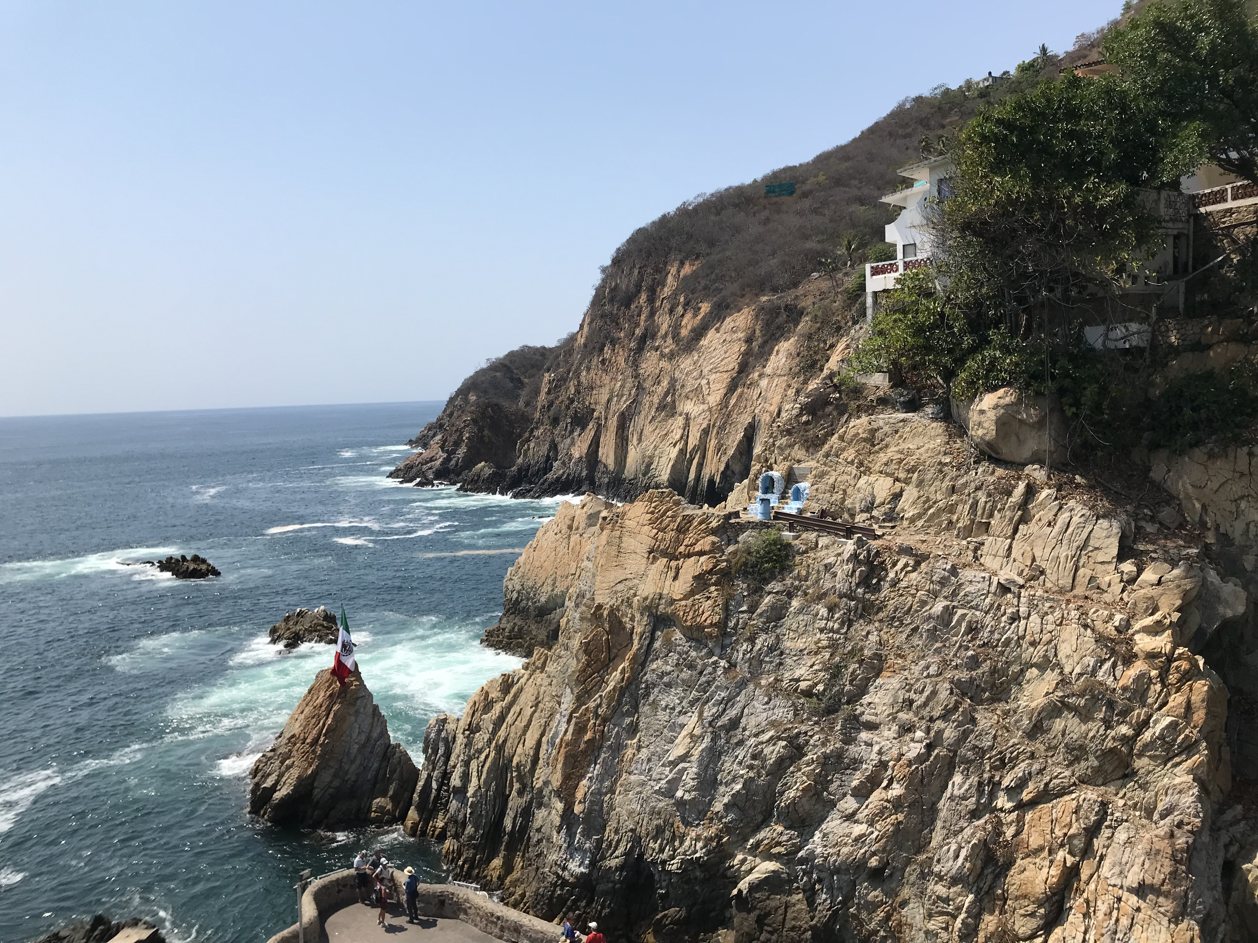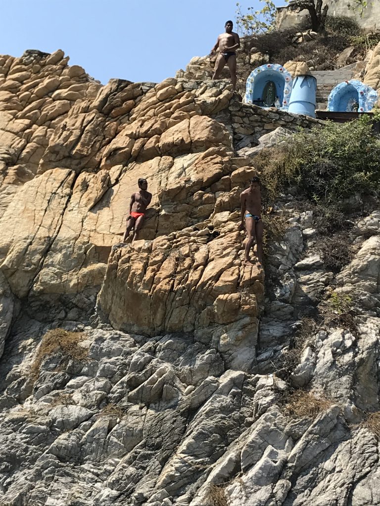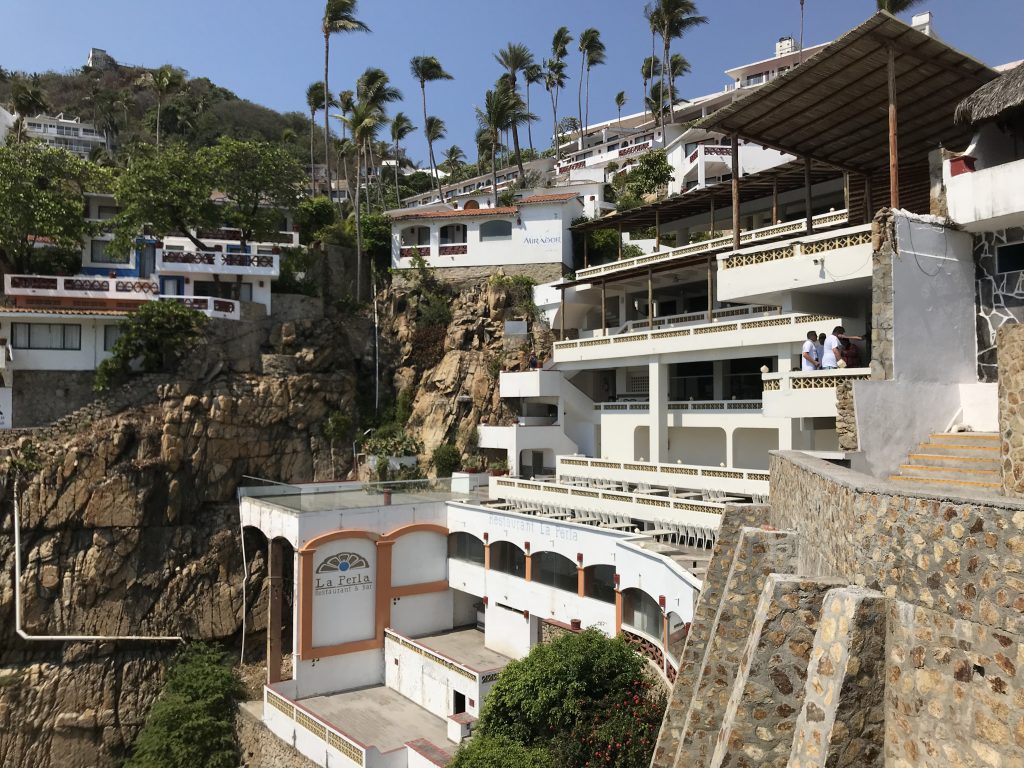Acapulco ist berühmt für seine Klippenspringer. Man findet sie bei den Klippen La Quebrada (Karte). Sie springen zu bestimmten Tageszeiten aus ca. 35 Metern Höhe in die in regelmäßigen Abständen heranflutenden Wellen des Pazifik und das wollten wir unbedingt sehen und natürlich die weltbekannte Terrasse La Perla des Hotel El Mirador!